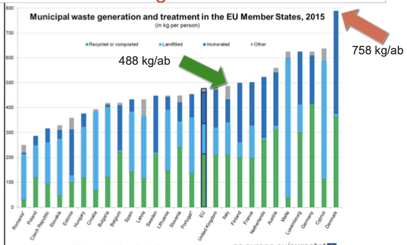 Ed è proprio così: un danese produce ogni anno 788 chili di scarti urbani, di cui il 54% è incenerito e il 42% riciclato, un vero record europeo.