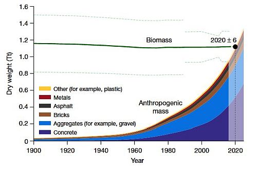 Uno studio uscito da poco (Global human-made mass exceeds all living biomass) ci informa che «l’insieme della massa creata dall’uomo eccede tutta la biomassa vivente». Gli autori hanno fatto un confronto storico tra la massa antropogenica e la biomassa del pianeta. La massa antropogenica consiste nella «massa incorporata in oggetti solidi inanimati fatti dall’uomo (che non sono ancora stati demoliti o messi fuori servizio)», quindi non comprende ciò che chiamiamo rifiuti. Nel 1900, la massa antropogenica era pari a circa il 3% della biomassa a secco. A partire dalla Seconda guerra mondiale, la massa antropogenica cresce di circa il 5% l’anno. Poi ha cominciato a raddoppiare ogni vent’anni. Il sorpasso avviene nell’anno 2020 (± 6), cioè più o meno adesso. Se però includiamo i rifiuti, il sorpasso è già avvenuto nel 2013 ± 5.