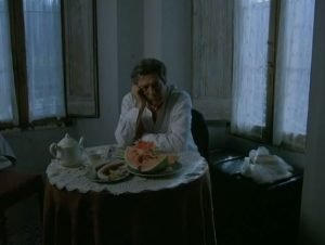 E poi Michalkov cambia ancora la storia rispetto al racconto, nel quale Anna se ne va dopo parecchi giorni, richiamata da una lettera del marito malato e accompagnata alla stazione dal suo amante. Nel film, invece, scappa di nascosto, quel giorno stesso. Romano, non vedendola a colazione, va a cercarla nella sua stanza. Porta con sé un’anguria (ancora!), nella quale ha intagliato un volto sorridente, mettendoci in cima il suo cappello. Con questa, fa scherzosamente capolino attraverso la porta, per rendersi poi subito conto che non c’è nessuno. Di nuovo la macchina da presa percorre la stanza, ma adesso è vuota, tutti gli oggetti sono spariti, è rimasto solo il piatto con le bucce dell’anguria al centro del tavolo, sul quale un’inquadratura si sofferma. La vita, l’amore, sono stati consumati, pensare che siano ancora interi è solo un’illusione o uno scherzo, appunto come l’anguria-faccia che domina la conclusione della scena, addirittura raddoppiata da uno specchio. Romano l’ha poggiata sul comodino accanto al letto, dove si è seduto a leggere la lettera d’addio di Anna, scritta in russo e quindi incomprensibile, come l’ultima frase che gli aveva detto. La scena finisce col primo piano dell’anguria intagliata con il suo vacuo sorriso, fuori posto in questo dramma come la superficialità (la vanitas) di Romano, illuso che nulla nella sua vita possa mai diventare importante.