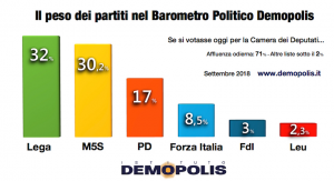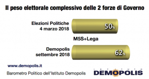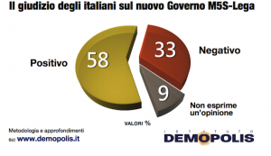 Anche il giudizio sull’operato del Governo rimane impressionantemente alto. E questo nonostante le critiche siano state numerose fin dalla fase di gestazione, da parte non solo – e non tanto – dall’opposizione politica (il PD in primis) apparsa tramortita e fuori gioco, ma pressoché da parte di tutta la grande stampa, le televisioni, i cosiddetti “poteri forti” (Confindustria a ranghi serrati, BCE, Commissari Europei, agenzie di rating, ecc,). Il che la dice lunga sull’efficacia di campagne come quella di “Repubblica”, con il fuoco sparato sul vero e tanto male (la politica disumana nei confronti dei migranti, affidata per la verità quasi solo alla penna coraggiosa di Saviano) e insieme sul poco e ipotetico bene (il rifiuto preconcetto di sia pur timide politiche sociali, la difesa a oltranza del piano Calenda sull’Ilva, dei Benetton e della società Autostrade, l’irrisione del reddito di cittadinanza, dell’idea stessa di nazionalizzazione per servizi essenziali come le infrastrutture autostradali, ecc.). Non giovano le balle sparate dai giornaloni a difesa degli indifendibili interessi dei loro proprietari (sul TAV in Val di Susa, per esempio, o sul TAP in Pugla, o sulla Gronda di Genova), che rendono poco credibili anche le (poche) giustificate denunce (come nel caso dei milioni di Euro occultati dalla Lega)… Per non parlare del Pd, che sembra far a gara per scegliersi obiettivi impopolari nella propria campagna d’autunno più feroce (si direbbe) contro i 5Stelle che contro Salvini e i suoi macellai (la difesa a oltranza del pareggio di bilancio e dei vincoli europei, della riforma pensionistica, del rigore e dell’austerità…). Il loro bollettino on line, “Democratica”, è arrivato ad attaccare Maurizio Landini per aver apprezzato l’accordo sull’Ilva giudicato (a ragione) migliore di quello del governo precedente (“Landini che fai, fiancheggi?”, di Mario Lavia).