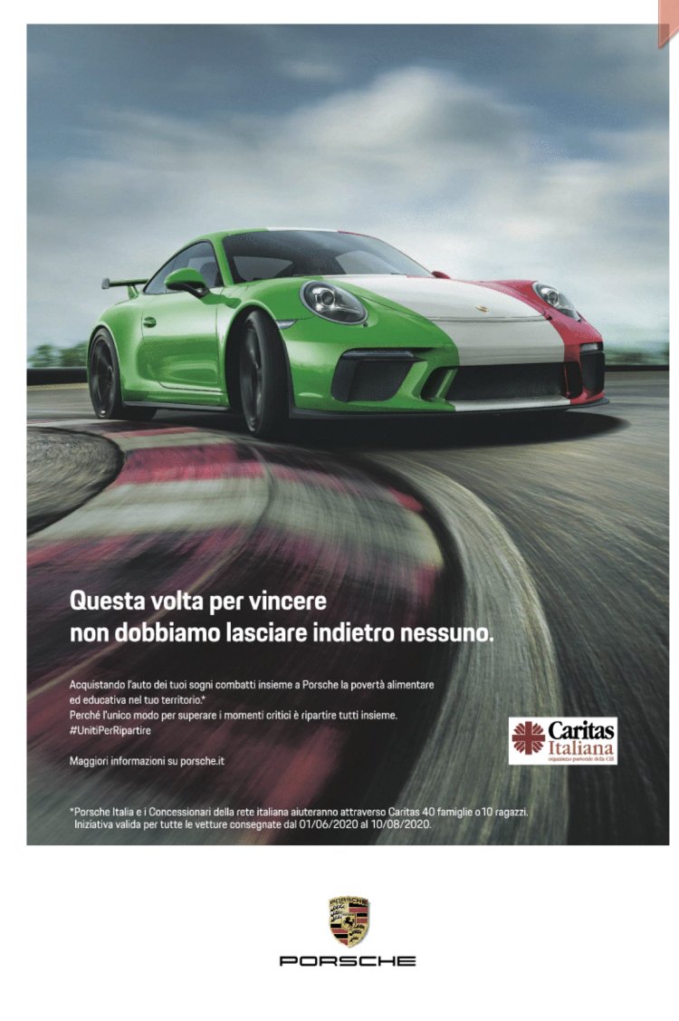 È una pubblicità letteralmente ingannevole. E non tanto perché l’automobile della fotografia appare colorata col tricolore italiano (essendo invece tedeschissima), ma soprattutto perché «acquistando l’auto dei tuoi sogni» tieni in piedi un mondo insostenibile, fondato su diseguaglianze spaventose e sulla continua induzione di bisogni inesistenti. E non combatti affatto la povertà: anzi, contribuisci a perpetuarne i presupposti profondi. Quanto al fatto che la combatteresti insieme a Porsche, questa è l’affermazione più lunare. I ricavi di Porsche nel 2019 ammontano a 28,5 miliardi di euro: se davvero questo colosso volesse «combattere la povertà» avrebbe decisamente altri mezzi che non il patetico obolo di 1000 euro per macchina venduta in Italia, per due mesi.