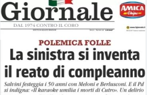 strappo della sensibilità che normalmente spinge anche i più rozzi tra i rozzi a non parlar di corda in casa dell’impiccato. Le cronache ci restituiscono una gioiosa “serata di brindisi con vino rigorosamente padano, paccheri al sugo bianco, filetto, torta ai frutti rossi, e karaoke”, tra il pubblico, ospite d’onore, Antonio Angelucci, immobiliarista, boss della sanità privata, un curriculum giudiziario di tutto rispetto, proprietario dei quotidiani che avrebbero parlato, a proposito del nuovo naufragio simile a quello di Cutro, di “Assalto all’Italia” e che, a proposito delle critiche al rave governativo di Ugiate Trevano , titoleranno ironizzando sul “reato di compleanno”…
