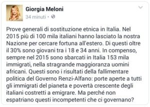 E ancora una volta mi soccorre, quantomeno con la fiammella della ragione, il già citato Günther Anders, che di questi sotterranei della contemporaneità ha più di ogni altro fatto oggetto di sofferta riflessione, e che ci ha spiegato, già una sessantina di anni fa, che “dolore, lutto e pietà, per poter nascere, hanno bisogno di quella particolare condizione che si chiama stima” perché – scrive – “noi possiamo sentirci in lutto solo per coloro che avremmo potuto stimare”. E questi nuovi governanti che c’infangano la terra, di quegli uomini, donne, bambini che noi oggi piangiamo non avevano nessuna stima. Li consideravano intrusi. Peggio, fattori di possibile inquinamento, in conformità di quella sciagurata dottrina che predica il pericolo della “sostituzione etnica” (qualcosa che sa tanto di parente con l’omologa “pulizia etnica”) o, più banalmente, “sostituzione del popolo”. Salvini ne è un capofila prolificissimo (Tomaso Montanari sul “Fatto” ne ha tracciato un documentato profilo). Ma nemmeno Meloni scherza. Forse oggi, chiamata a frequentare i salotti buoni internazionali non gradisce che lo si ricordi, ma pochi anni fa twittava amabilmente contro l’UE, “complice dell’immigrazione incontrollata, dell’invasione dell’Europa e del progetto di sostituzione etnica dei cittadini europei volute dal grande capitale e dagli speculatori internazionali”, indignata perché la Commissaria Mogherini si era permessa di affermare che senza i migranti ci “sarebbe il crollo delle nostre società”. E poco dopo si ripeteva cinguettando di “Prove generali di sostituzione etnica in Italia” dimostrate dal fatto che in quell’anno più di 100 mila italiani avevano lasciato la nostra Nazione mentre in compenso, erano “sbarcati 153 mila immigrati, nella stragrande maggioranza uomini africani”.