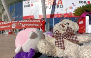 Per la cronaca, eravamo una quarantina. Altri si sono aggiunti alla spicciolata. Inoltre la platea presentava ampi vuoti, molti non sono entrati. Comunque sì, siamo stati una ridotta minoranza. Ma al mattino nessuno ha contestato i nostri striscioni, molte/i hanno voluto fotografarli, tante/i hanno preso i peluche per esibirli sul proprio tavolino. Molte/i compagne/i erano con noi. Sono convinto che abbiamo compiuto un gesto anche per conto di molti che, per un malinteso senso di bon ton istituzionale o per disciplina, non si sono mossi dal banco.