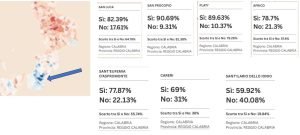 E visto che ci siamo, apriamo una piccola finestra su un gruppetto di piccoli comuni di un altro territorio “sensibile”, quella macchia blu sulla mappa della Calabria, proprio sulla punta dello stivale, che corrisponde alla Locride San Luca, San Procopio, Platì, Africo, Sant’Eufemia d’Aspromonte, Careri, Sant’Ilario dello Jonio). Una raffica di risultati bulgari per il SI, in comuni che hanno tutti al proprio attivo al minimo uno scioglimento per infiltrazione mafiose, a conferma di quelle sacrosante parole del Procuratore Gratteri, che per quella ragione è stato crocifisso dai pasdaran di SI:
