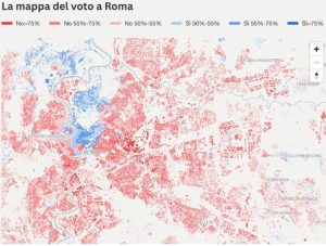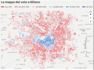 Tutte le metropoli (intorno al milione di abitanti) hanno votato massicciamente per il NO. Così Roma (60,33%), Milano (58,33), Napoli, naturalmente, col suo record del 75,49%, Torino (64,76%). Altrettanto hanno fatto tutte le “grandi città” (sopra i 100.000 abitanti, tranne Verona e Reggio Calabria): Genova (64,02), Bologna (68,33), Firenze (66,57), Palermo (68,94), Bari (57,14), Catania (63,47), Venezia (55,13), Messina (58,85). Può essere interessante dare uno sguardo più ravvicinato alle mappe delle metropoli, che registrano i risultati seggio per seggio (in rosso quelli con maggioranza NO, in blu quelli per il SI). Si potrà notare l’estensione quasi completa del rosso, con solo alcune macchie circoscritte di blu, in una rappresentazione topografica che – in alcuni casi – rovescia lo schema della ZTL, che nelle precedenti elezioni, politiche e amministrative, voleva il PD e più in generale il centro-sinistra asserragliato nei quartieri del centro o comunque benestanti e il centro destra accampato nelle semi-periferie, nelle periferie, nelle barriere o comunque nei quartieri più indigenti. Qui sono invece le zone centrali e residenziali le sole in cui il SI ha prevalso. Così ad esempio a Torino, dove un pallido azzurro compare solo nei seggi intorno all’asse centralissimo di Via Roma. Oppure a Milano, dove una consistente macchia blu si concentra entro l’ottagono che contiene le zone Duomo e Castello sforzesco (quelle in cui è localizzato il Finanzcapitalismo), mentre il resto è rosa o rosso con accentuazioni a Conchetta, Loreto, Portello, Barona. A Roma, invece, la mappa ci restituisce un’estensione vastissima colorata di rosso, comprendente quasi tutti i municipi, con risultati oscillanti intorno al 60% (con punte massime del 67% al Municipio VII, e basse al Municipio VI col 53%. Unica eccezione il Municipio XV dove il SI prevale per un pelo: 50,72%. Mentre Napoli è assolutamente omogenea, con l’unica variazione tra le sfumature di Rosso (rosa quelle poco sopra il 50%, porpora intenso oltre il 60%), come pure Palermo.