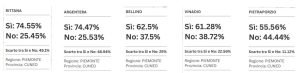 All’opposto i comuni piccoli o piccolissimi, dove il SI si è affermato più diffusamente, soprattutto nelle aree vallive del centro-nord, e con dimensioni spesso elevate, in particolare nei cosiddetti “comuni-polvere”, con l’eccezione delle aree in cui si siano manifestati negli ultimi anni significativi movimenti di protesta con radicamento territoriale, dove invece il NO rialza la testa. Un esempio del primo tipo che, come si può immaginare, conosco bene è costituito dalle valli del cuneese, quelle la cui etnografia è descritta nel Mondo dei vinti, che sono state desertificate dallo spopolamento nell’epoca del boom economico e che da allora non si sono più riprese, quantomeno dal punto di vista demografico. In Valle Stura, per esempio, dove ormai da tempo si vota a destra, nonostante sia stata protagonista della lotta partigiana, disseminata di comuni dalle dimensioni minime (50, 100 abitanti quando va bene) il SI ha prevalso in misura massiccia, tanto più grande quanto più ci si allontana dal capoluogo (si veda la striscia qui sotto i risultati di Rittana, Argentera, Bellino, Vinadio e Pietraporzio).
