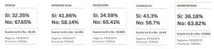 All’opposto la media e bassa Val di Susa, da vent’anni protagonista della battaglia contro il TAV. Qui, in comuni dalle dimensioni non molto diverse (Venaus, Borgone, Bussoleno, Chianocco, Monpantero), si registrano risultati opposti, con una forte o fortissima prevalenza del NO.