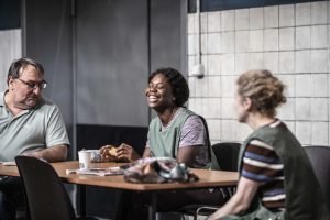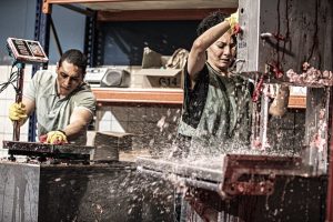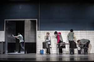 Occorre scacciare subito la tentazione di lasciarsi guidare, nell’interpretazione di Beyond caring (Prendersi cura) dell’autore e regista teatrale inglese Alexander Zeldin, da una certa aria brechtiana che circola nel finale di questo lavoro, visto al Teatro Due di Parma. L’apparizione di grandi congegni metallici incrostati dai resti della lavorazione della carne di una macelleria industriale, asportati a fatica da quattro addetti alle pulizie assunti da un’agenzia interinale senza alcuna tutela, non ha niente a che fare con il mondo di Santa Giovanna dei Macelli.