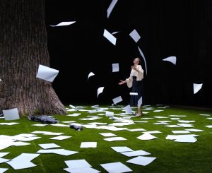 Virginia Woolf ha dato il meglio di sé nei suoi romanzi “moderni”, meno appariscenti ma più profondi di questo. Il trattamento del tempo in Orlando, che colpisce il lettore in modo teatrale con l’effetto speciale di una biografia transessuale e plurisecolare che attraversa tutta l’età moderna, trova in Mrs. Dalloway e To the Lighthouse espressioni più vibranti di vita e di verità. La scena di Giuseppe Stellato emblematizza un momento iniziale di questa fantasticheria, quando Orlando giovinetto, prima di sperimentare i piaceri e soprattutto i dolori dell’esistenza, guarda il paesaggio inglese punteggiato di castelli dall’alto di una radura, dominata da una grande quercia. Da essa deriva il titolo di un Poema, uno dei tanti manoscritti di cui è zeppo il suo armadio. L’iperbolico tronco di questo albero di cui non si vede la chioma, grande come le sequoie in Vertigo di Hitchcock, e come esse simbolo del doloroso rapporto tra fragilità umana e forza della natura, è posto al centro di un prato d’erba verde che copre tutta la scena, illuminato a giorno dal bel disegno luci di Pasquale Mari: un prato scintillante, quasi senza ombre, la cui luminosità, come la fervida immaginazione romanzesca di Orlando, offende un po’ gli occhi. Ora appoggiata, ora abbracciata alla grande quercia, non vestita dei panni lussureggianti dell’Orlando romanzesco ma di un’ampia camicia bianca e di una lunga antiquata gonna, rinforzata e quasi abbracciata essa stessa da festanti suoni di campane, Anna Della Rosa fende in semicerchi e zig zag tutto lo spazio disponibile, ad ampie e impetuose falcate.
