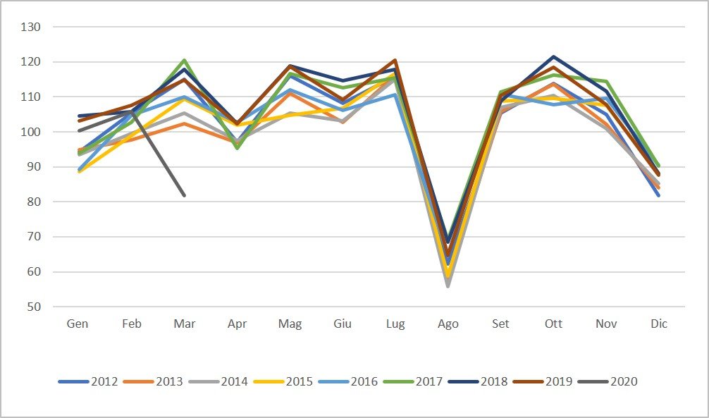 Fig. 1. Indice grezzo della produzione industriale manifatturiera in Italia (2015=100) 2012-2020 (marzo)