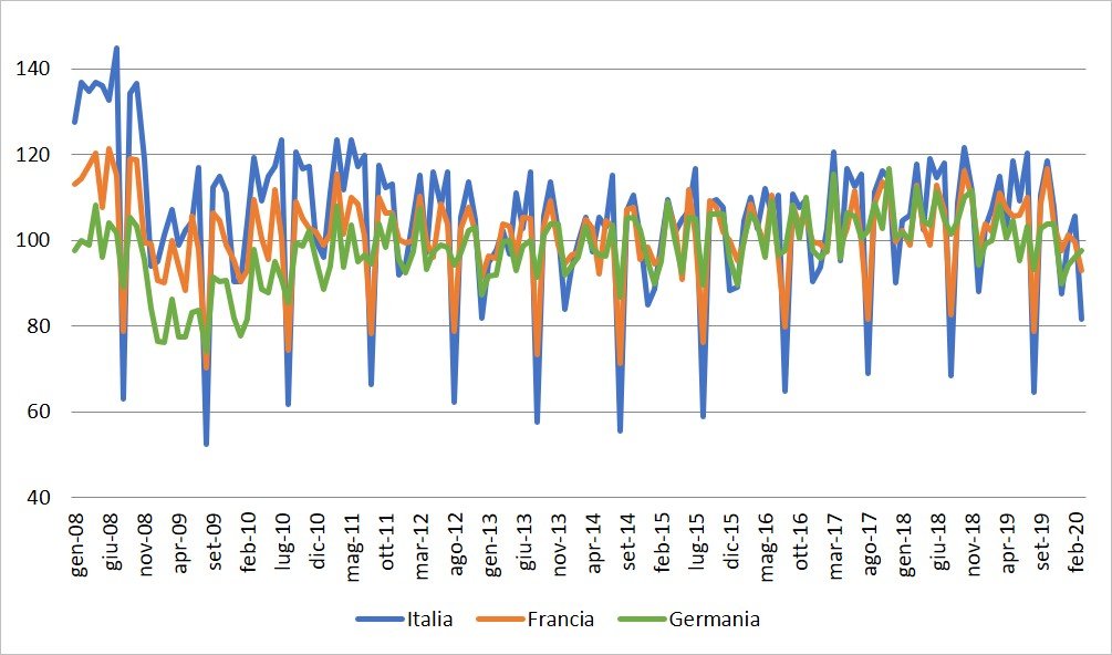 Fig. 2. Indice grezzo della produzione industriale manifatturiera Italia, Francia e Germania (2015=100) 2008-2020 (marzo)