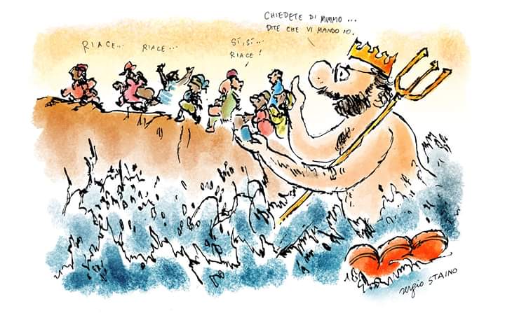 «Chiedete di Mimmo… dite che vi mando io». A parlare è il dio del mare in persona, mentre adagia sulle coste calabresi un gruppo di persone appena scampate al viaggio in mare. Così Staino rappresenta la sua Riace in una delle numerose illustrazioni e vignette arrivate a Torino in occasione di Matite per Riace. Una chiamata alle arti in supporto di «quell’idea di umanità, di accoglienza e di aiuto del più debole che ha fatto sì che Riace venisse riconosciuta in tutto il mondo come possibilità reale e concreta di gestione dei flussi migratori, creando una nuova idea di comunità fondata sulla pace, il rispetto e l’amore».