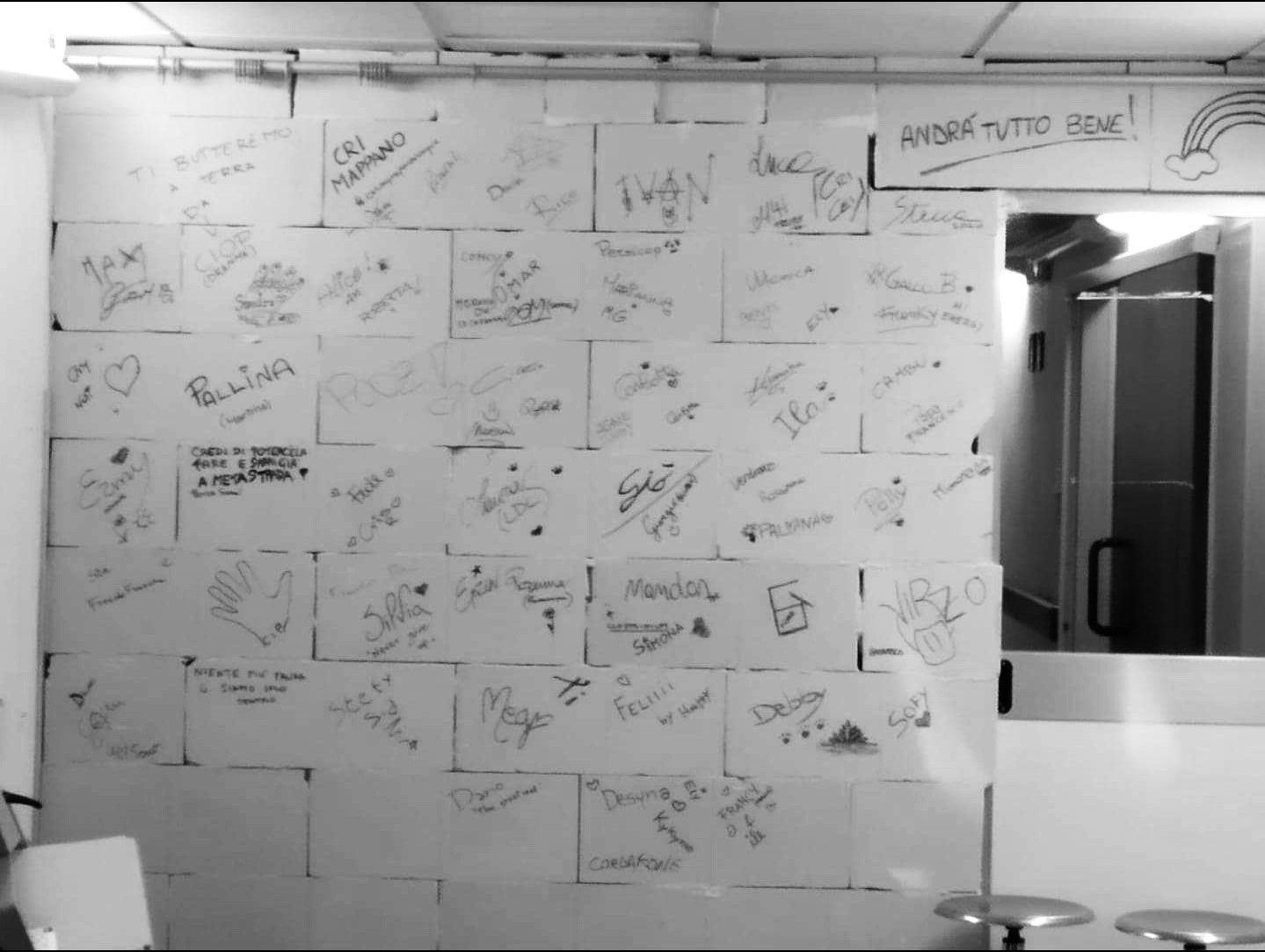 Quando, però, a partire dal secondo giorno iniziamo a riempire le altre stanze, che non hanno un vetro, la situazione si complica. Bussiamo sulla porta per richiamare l’attenzione di chi si trova all’esterno, poi lasciamo scivolare un foglio sotto la porta e chi sta fuori (senza toccarlo) lo fotografa o ci porta il materiale necessario.