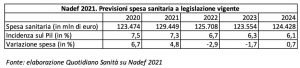 Non procedo oltre ad argomentare con il richiamo ad altri articoli della Costituzione, dai primi 12, all’art.117, all’art. 119, importantissimo sul piano finanziario e per la sanità pubblica. Mi limito a osservare che l’azione politica del Governo Draghi e del ministro Speranza, nonostante l’ipocrisia delle continue dichiarazioni in senso contrario, comporta la demolizione del Servizio sanitario nazionale pubblico come si conferma nel fatto che, oltre al predetto disegno di legge sull’autonomia differenziata, con la stessa Nota aggiuntiva 2021, si anticipa/prevede una scandalosa riduzione di finanziamenti del SSN tra il 2021 e il 2024, addirittura in cifra assoluta e non solo in termini di incidenza su un PIL, comunque previsto in crescita (vedi tabella che segue).
