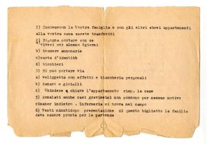 Questo biglietto fu consegnato dai nazisti agli ebrei da arrestare durante il rastrellamento del ghetto di Roma il 16 ottobre 1943 e un suo originale è conservato presso la Fondazione Museo della Shoah: