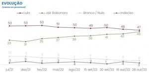 Entrando al seggio per votare Lula ha dichiarato: «Oggi è forse il giorno più importante della mia vita e penso che sia un giorno molto importante per il popolo brasiliano, perché oggi le persone stanno definendo il modello del Brasile che vogliono, il modello di vita che vogliono». È proprio così, ma la strada sarà molto impegnativa dovendosi confrontare con una destra molto forte in un Paese spaccato. All’inizio della campagna elettorale sembrava una vittoria facile tale era la disistima per il presidente in carica e ancora nei sondaggi di sabato 29 ottobre il divario dei consensi elettorali tra i due candidati oscillava da un minimo di due a un massimo di otto punti. Come era già avvenuto per il primo turno le differenze reali negli orientamenti elettorali erano inferiori al previsto, e alcuni elettori intervistati non sono stati sinceri. È meglio comunque ricordare il trend dei sondaggi pubblicato dall’istituto che più si è avvicinato all’esito reale: