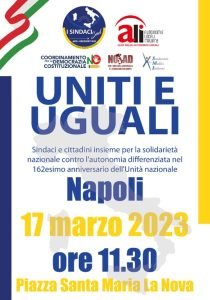 Sindaci e cittadini insieme per la solidarietà nazionale contro l’autonomia differenziata nel 162esimo anniversario dell’Unità nazionale: è l’iniziativa promossa dalla Rete dei sindaci Recovery Sud che si svolgerà a Napoli il prossimo 17 marzo.