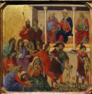 Nella Maestà dipinta per il Duomo di Siena, dipinta negli anni in cui Dante scriveva la Commedia, Duccio veste Erode come un imperatore dei suoi tempi: la corona, le scarpe, il trono non lo confinano in un passato fiabesco in cui ogni orrore è possibile, ma lo proiettano nel presente, così svelando il volto mostruoso e inumano di ogni potere. Terribili sono i due consiglieri, che seggono accanto al re infanticida tenendo in mano i libri dei codici: trasparente allusione al fatto che le leggi e chi le interpreta si riducono sovente a docili strumenti del potere. Atroci i volti dei soldati: vi si legge un’angoscia che non riesce a trasformarsi in insubordinazione e diserzione. Padri essi stessi: ma alla fine disposti ad uccidere i figli degli altri. Come troppo spesso nella storia, le uniche figure umane sono quelle femminili: queste madri scarmigliate e disperate, che provano inutilmente a difendere i loro bambini, o li piangono quando ormai sono stati trucidati.
