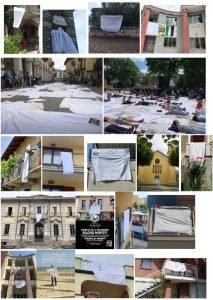 Sono molti anche i Comuni, da nord a sud che sabato hanno appeso il lenzuolo, alcuni accanto alla bandiera della pace, altri accanto alla bandiera italiana e poi c’è sempre il Napoli che ha vinto lo scudetto. Una chiesa ha appeso un lungo telo bianco davanti al portone. «Come si fa a piangere 50mila morti?». Un frate francescano ha postato su Fb il lenzuolo con una scritta: «Ci sono momenti nella vita in cui gridare è il solo dovere, come Giovanni nel deserto. Giorgio La Pira Pozzallo 1904». Anche l’ospedale Maggiore di Bologna ha ricoperto la facciata con le lenzuola.