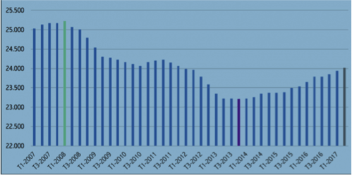 Quindi il numero di lavoratrici e di lavoratori che dichiara di aver lavorato più di un’ora nella settimana dell’intervista dell’ISTAT è aumentato di 795mila unità ma di queste ben 770mila stavano lavorando con un contratto a termine. Da sottolineare il dato del 2016 con 244mila rapporti a tempo indeterminato in più per effetto degli 8.000 euro di sgravi fiscali e contributivi per assunzione.
