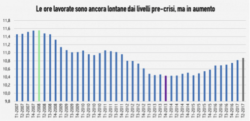 Oltre all’incidenza dei contratti a termine deve essere sottolineata l’importanza dei contratti part time che sono ormai più di 2,6 milioni. Ecco i dati, in miliardi di ore per trimestre: