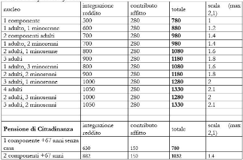 Nella tabella sottostante sono riportati alcuni esempi di soglie massime del benefico economico assegnate al variare della composizione del nucleo. Il trasferimento effettivamente erogato è calcolato come il differenziale tra la soglia massima e il reddito disponibile, meno eventuali trattamenti assistenziali.