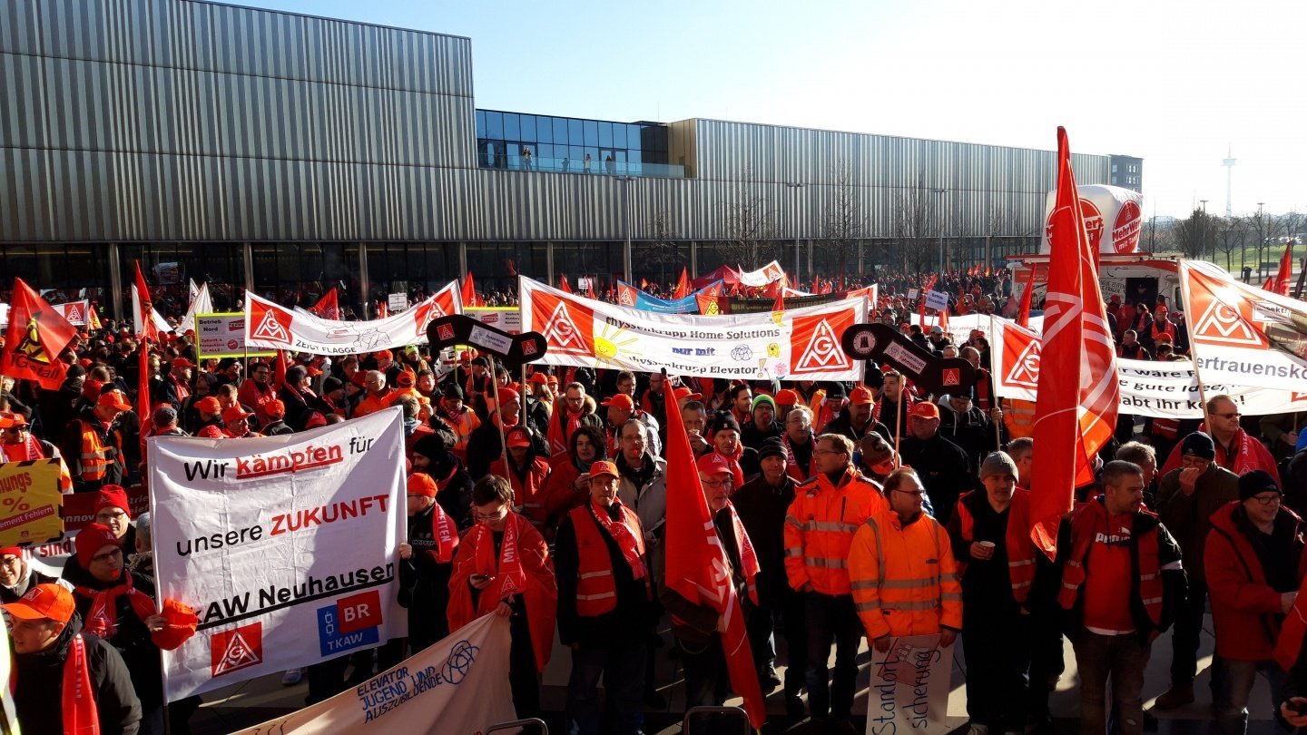 Il 4 dicembre 2.500 lavoratori della Thyssenkrupp Elevator si sono radunati a Essen, in Germania, presso la sede del gruppo, chiedendo una chiara strategia e garanzie di lavoro. Solo un giorno prima, il 3 dicembre, circa 6.000 lavoratori delle acciaierie avevano organizzato il loro raduno a Duisburg, sempre in Germania.