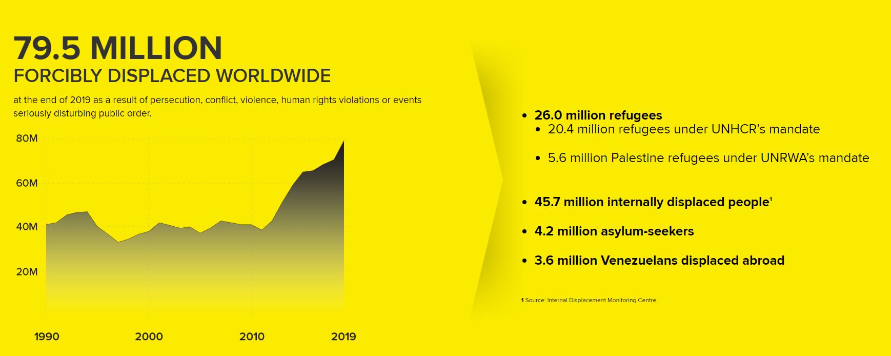 Lo sfollamento forzato ora colpisce oltre l’1% dell’umanità. Lo sfollamento globale ha raggiunto un record di 79,5 milioni di persone alla fine dello scorso anno – quasi il doppio rispetto a un decennio fa, secondo il rapporto annuale Global Trends dell’UNHCR pubblicato giovedì. Il rapporto rileva che nel 2019 altre 8,7 milioni di persone sono state sradicate dalle loro case, un aumento che l’UNHCR ha attribuito a “preoccupanti nuovi sfollamenti”, in particolare nella Repubblica Democratica del Congo, nel Sahel, nello Yemen e in Siria, nonché i 3,6 milioni di venezuelani che si sono trasferiti fuori dal loro paese. La cifra di 79,5 milioni – che comprende 26 milioni di rifugiati, 45,7 milioni di sfollati interni e 4,2 milioni di richiedenti asilo – rappresenta oltre l’uno per cento della popolazione mondiale.