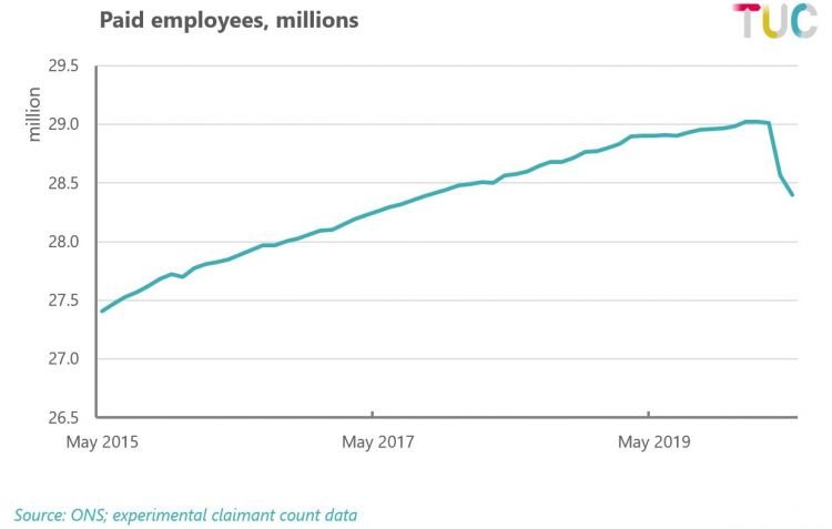 I nuovi dati sul numero di dipendenti nel Regno Unito mostrano che questo è diminuito di 600.000 unità tra marzo e maggio 2020.