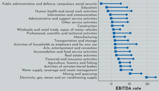 Il grafico indica il range di redditività media per settore a 32 ore applicate (EBITDA rate è il metodo utilizzato per valutare la redditività di un’azienda confrontando i ricavi lordi con i guadagni), il simbolo del quadrato indica il grado di redditività nello scenario peggiore e il simbolo rotondo quello migliore.