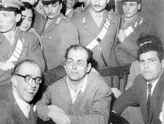 Danilo Dolci (al centro) con Piero Calamandrei (in primo piano a sinistra) al processo del marzo 1956.