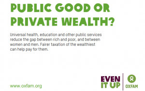 La nostra economia è spaccata in due, con centinaia di milioni di persone che vivono in condizioni di estrema povertà mentre enormi quote di ricchezza vanno a quelli che stanno in cima. Il numero di miliardari è raddoppiato dalla crisi finanziaria e le loro fortune crescono di 2,5 miliardi di dollari al giorno, eppure i super-ricchi e le Corporations pagano aliquote fiscali più basse rispetto ai decenni precedenti. I costi umani – bambini senza insegnanti, cliniche senza farmaci – sono enormi. I servizi privati frammentari puniscono i poveri e privilegiano le élite. Le donne soffrono di più, e sono lasciate a colmare le lacune nei servizi pubblici con molte ore di tempo dedicato alla cura non retribuite. Abbiamo bisogno di trasformare le nostre economie per offrire salute, educazione e altri servizi pubblici universali. Per rendere ciò possibile, le persone e le società più ricche dovrebbero pagare la loro giusta quota di tasse, così da determinare una drastica riduzione del divario tra ricchi e poveri e tra donne e uomini.