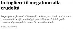 Questa non è censura, perché il potere censura; sarebbe, invece, una forma disperata di opposizione all’orrore. Costringiamo Salvini a parlare di politica nell’esercizio del suo ruolo chiave di ministro dell’Interno. Altrimenti abituiamoci ad avere un ministero della Crudeltà e rassegnamoci all’idea che le future generazioni dovranno fare i conti con un concetto di libertà proprio dei regimi autoritari, ai quali appunto guarda con trasporto il ministro della Crudeltà.