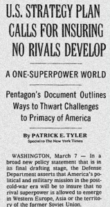 “Il nostro primo obiettivo è impedire il riemergere di un nuovo rivale, sul territorio dell’ex Unione Sovietica o altrove, che rappresenti una minaccia paragonabile a quella posta in precedenza dall’Unione Sovietica. Questa è una considerazione principale alla base della nuova strategia di difesa regionale e richiede che ci adoperiamo per impedire a qualsiasi potenza ostile di dominare una regione le cui risorse, sotto un controllo consolidato, sarebbero sufficienti per generare una potenza globale.