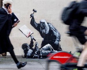 (2) Immagini che fanno il paio con il nuovo murale proprio di Bansky, apparso – e poi subito rimosso- sulla facciata dell’edificio della Royal Courts of Justice, nel centro di Londra, raffigurante un giudice con la tradizionale parrucca e toga nera che colpisce un manifestante steso a terra, con schizzi di sangue che macchiano il suo cartello di protesta (https://www.theguardian.com/artanddesign/2025/sep/08/court-staff-cover-up-banksy-image-of-judge-beating-a-protester).
