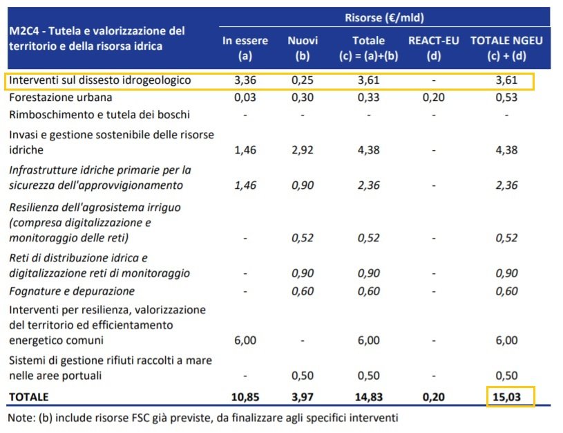 Nella bozza del PNRR del 12 gennaio stilata dal II governo Conte per usare i 210 miliardi di euro previsti per l’Italia da NextGenerationEU, per la tutela e la valorizzazione del territorio e della risorsa idrica sono previsti 15 miliardi di euro. Tra gli obiettivi, la riduzione degli sprechi e una gestione sostenibile. Quella che è descritta come un’importante riforma tramite il “rafforzamento della governance” non sembra però esserlo nella pratica. «Il Recovery plan allarga l’ambito di competenza, soprattutto al Sud, di alcune aziende multiservizio quotate in borsa, che gestiscono servizi fondamentali come l’acqua, i rifiuti, la luce e il gas, sempre le stesse», spiega Carsetti. Inoltre, per far fronte al problema del dissesto idrogeologico, l’Istituto superiore per la protezione e la ricerca ambientale (ISPRA) aveva quantificato in 26 miliardi di euro le risorse necessarie. Nel piano sono state stanziate le briciole: 3,6 miliardi.