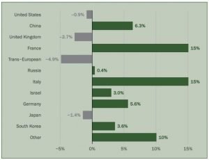 La variazione delle vendite a seconda del Paese di appartenenza. Fonte: Sipri, 2022