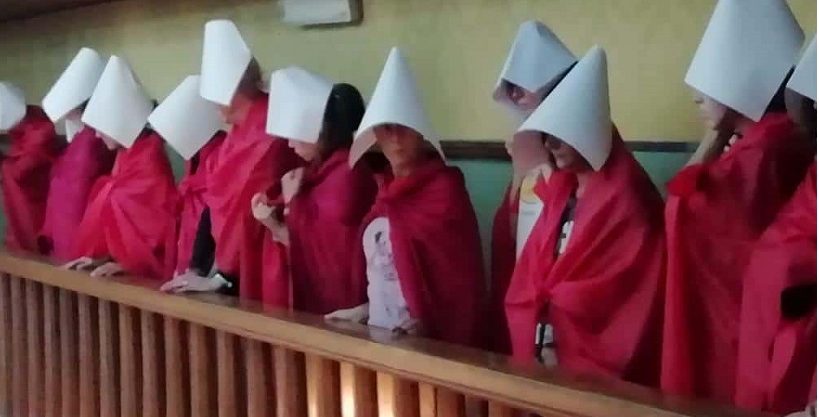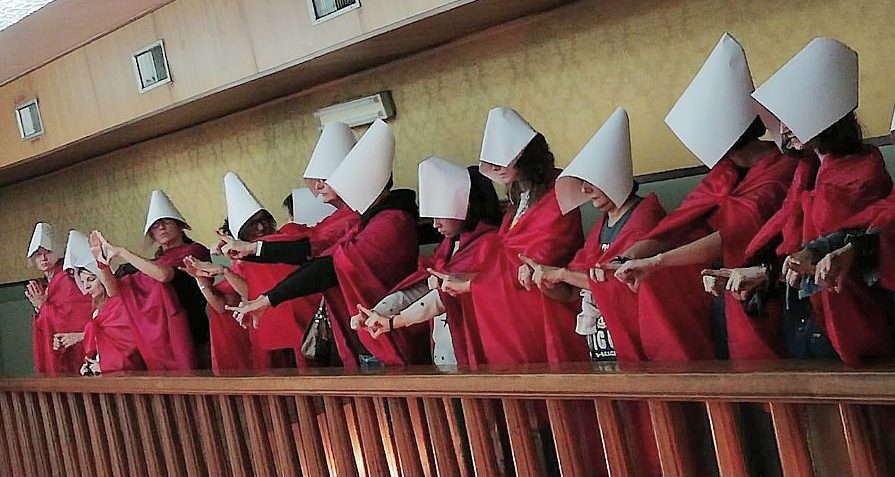 È un bene che la notizia dell’iniziativa veronese sia circolata in rete accompagnata dalla foto che immortala l’azione delle attiviste di “Nonunadimeno” che hanno protestato silenziosamente, assistendo al voto vestite come le ancelle della serie tv Handsmaid’s Tale. La serie, tratta dal romanzo distopico di Margareth Atwood, racconta una società governata da estremisti cattolici dove le donne perdono ogni diritto e vengono usate solo a scopo procreativo. La capacità delle attiviste di intervenire, attraverso un gioco di immaginario, in questo tentativo di riportare indietro le lancette della storia fa tirare un sospiro di sollievo e rimette un po’ di ordine in quello che sta succedendo. I corpi delle attiviste avvolti in mantelli rossi e con copricapi bianchi, raccontano della capacità di elaborare e restituire come una messa in scena l’operato degli amministratori veronesi, affaticati nel lavoro di restaurazione di un ordine simbolico che alle donne di oggi, tutte, non può apparire che distopico.