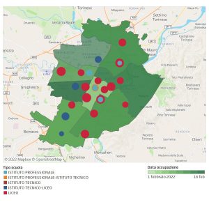 Inoltre, gli studenti delle 28 scuole che si sono mobilitate nella città, rappresentano il 63% degli studenti torinesi: una percentuale quindi di tutto rispetto. Un bacino potenziale di reclutamento e costruzione del consenso, se esistessero ancora dei partiti degni di questo nome e interessati a fare scouting nei movimenti. Ma il raccordo tra partiti e movimenti si è spezzato, non da oggi. I percorsi di reclutamento, selezione e formazione della classe politica si sono trasformati sotto la spinta della tecnicizzazione e della crisi dei partiti. Del resto, se scomponiamo per tipo di istituto, vediamo che questa percentuale è fortemente sbilanciata a favore dei licei, che sono appunto la gran parte delle scuole mobilitate. Fatto 100 il totale degli studenti secondari di Torino, si sono mobilitati l’80% degli studenti liceali e il 20% di studenti tecnici e professionali. Questa composizione “di classe” della mobilitazione ha poi una chiara impronta spaziale e temporale. Dove è iniziata la mobilitazione? Fino a dove è arrivata? Se proviamo a rispondere a queste domande attraverso la mappa qui di seguito, osserviamo chiaramente che la distribuzione geografica degli istituti penalizza la zona nord e nord-est della città: quella oltre il fiume Dora, con redditi più bassi e indici di deprivazione più elevati.