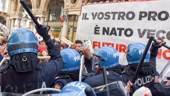 La polizia spezza il corteo che si va formando e blocca in piazza Vittorio la numerosa componente No TAV, impedendole l’ingresso in via Po. Ai margini della piazza, sotto i portici, le “forze dell’ordine” strappano le bandiere No TAV ad alcuni manifestanti che vengono anche strattonati e colpiti con manganelli. La piazza grida “Vergogna, vergogna!”.
