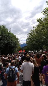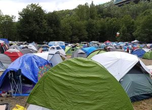 Arrivano da tutta Italia e anche dall’estero, arrivano in auto fino a Susa, in treno, in moto e poi usano le navette gratuite per raggiungere il piccolo comune montano (900 abitanti). Arrivano con zaini, borracce. Si chiamano “tende a strappo” sono leggere, circolari e in un attimo sono montate sul prato, una accanto all’altra a formare un’onda enorme di teli blu. Un’onda come il grido che risuona per tutta l’area da centinaia di ragazzi che scandiscono: “siamo tutti antifascisti”.