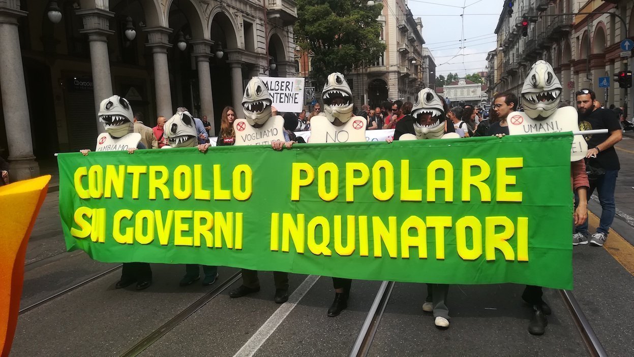 La domanda rimane senza risposta, non resta che osservare. Le scritte sono le più svariate. Da “avete rotto i polmoni”, a “se credete che l’economia sia importante, provate a trattenere il fiato mentre contate i soldi”. Slogan che rimandano a quel “siamo realisti, esigiamo l’impossibile” di cinquant’anni addietro. Una manifestazione toccante, che si celebra fra cori, grida, il Rino Gaetano de “Il cielo è sempre più blu”, e un sit in di silenzio.