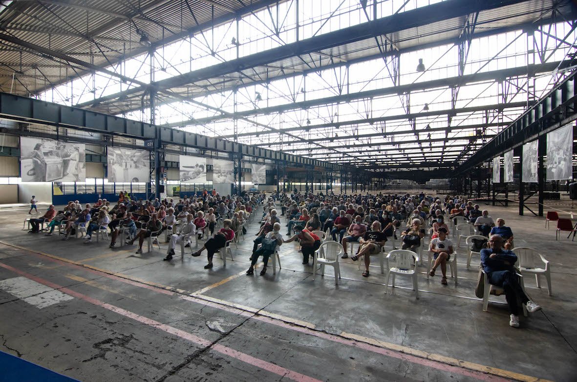 Anche durante e alla fine della proiezione del film è stata attivata la sirena. Organizzare la visione all’interno della fabbrica aveva una importanza speciale. Grazie alla disponibilità del Gruppo CLN Magnetto Wheels, attuale proprietaria dell’area industriale, si è messo in moto quello che si sarebbe dimostrato un vero tour de force di tantissimi volontari: soci del Valsusa Filmfest, dell’associazione Moon Live, della Pro Loco, Aib, Alpini, Vigili del Fuoco ecc. Un reggimento di persone che hanno rubato tempo e sonno al quotidiano per cercare di ottemperare a tutte le norme previste in quest’epoca di pandemia. L’area a disposizione era di trentacinquemila metri quadri. Solo chi organizza eventi sa quanto sia complicato districarsi fra decreto Gabrielli e nuovi decreti. È stato un lavoro che definire “enorme” non è sbagliato e che sicuramente ha contribuito e cementare rapporti fra persone, spazzando via normali frizioni che sempre esistono fra associazioni diverse. Se si lavora, contro il tempo e contro le stupidaggini burocratiche, dando il massimo in sforzo fisico e intellettuale la fratellanza vince. Si lavora per la Comunità. Questo sentimento di appartenenza è una delle poche cose per cui vale la pena di impegnarsi: nessun leader, ma un lavoro d’insieme che alla fine produce il fischio della sirena e il portone della Monce che si riapre.